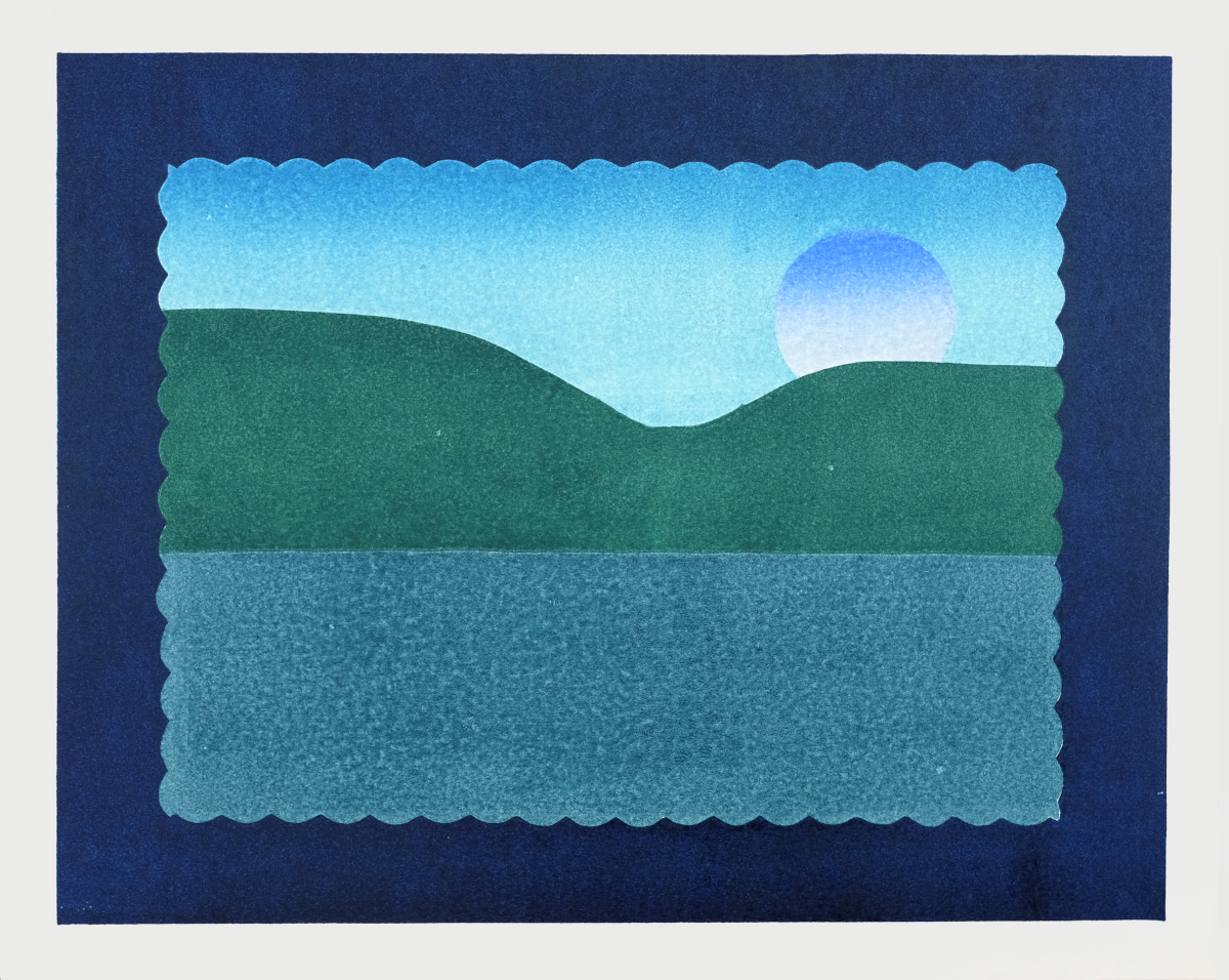 Lune mauve, immeuble, montagne verte et ciel bleu, 2019 estampe en cinq couleurs - five color relief print 38 x 25,5 cm édition de 3 ex. variables |