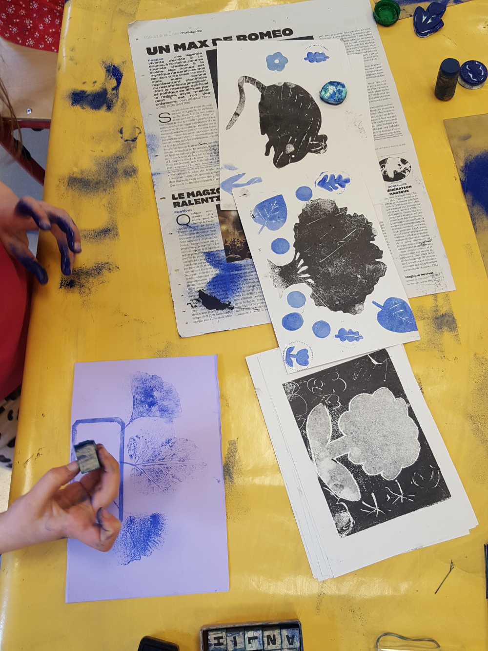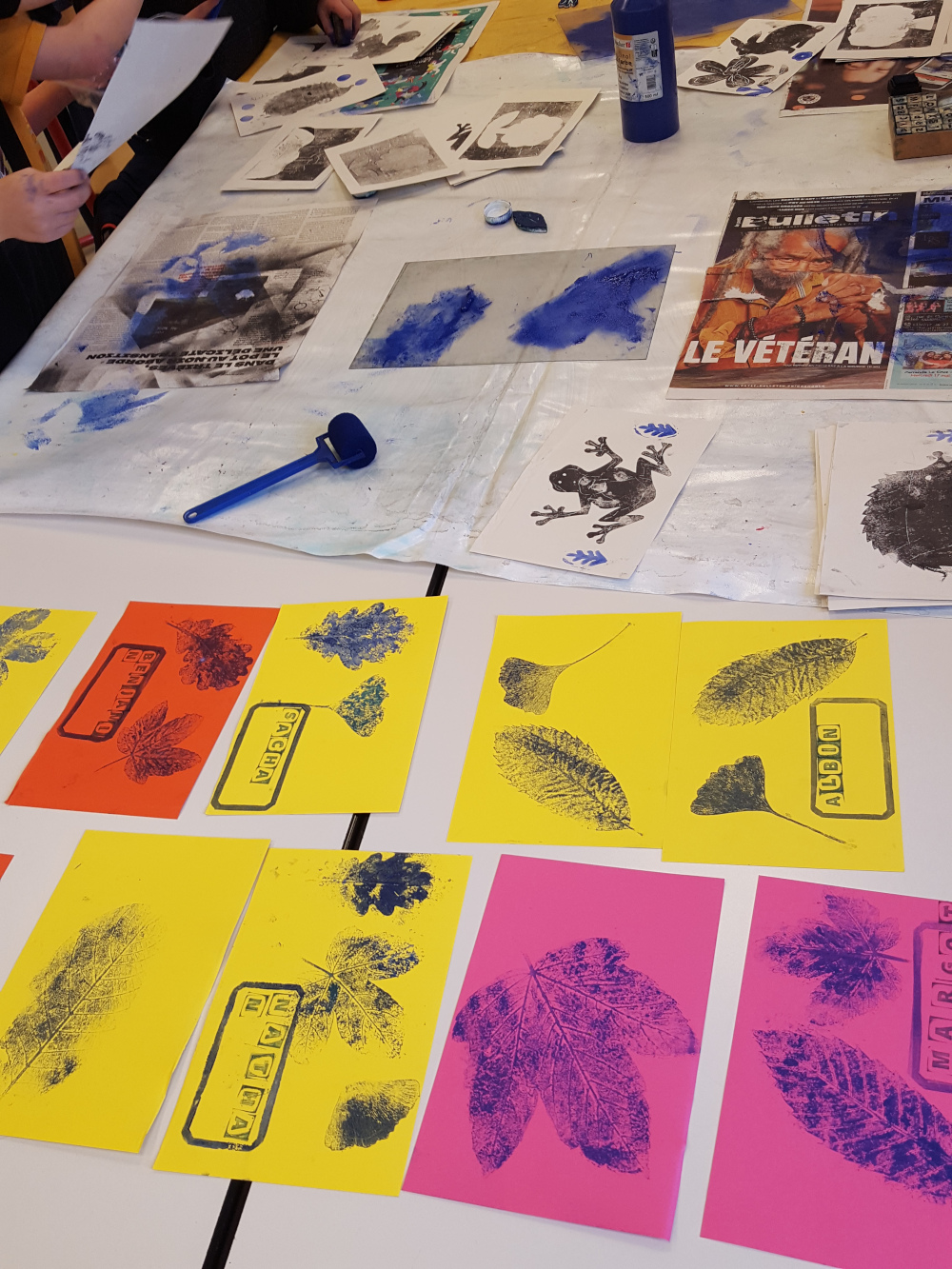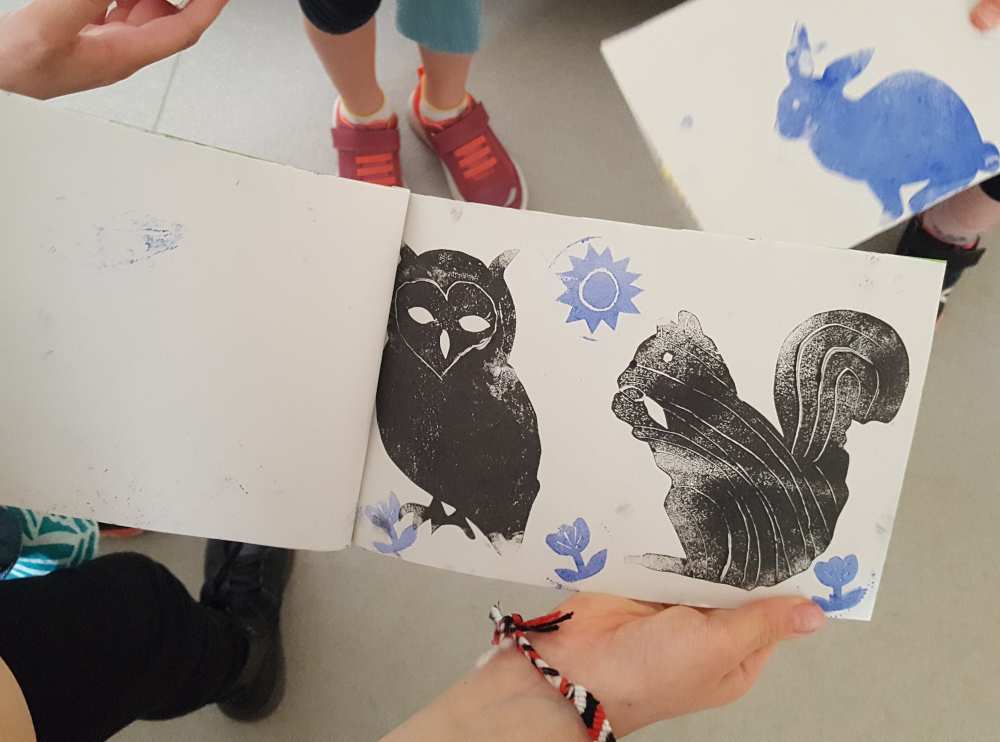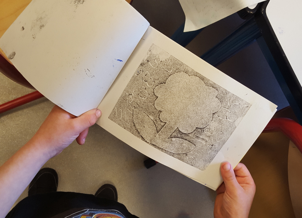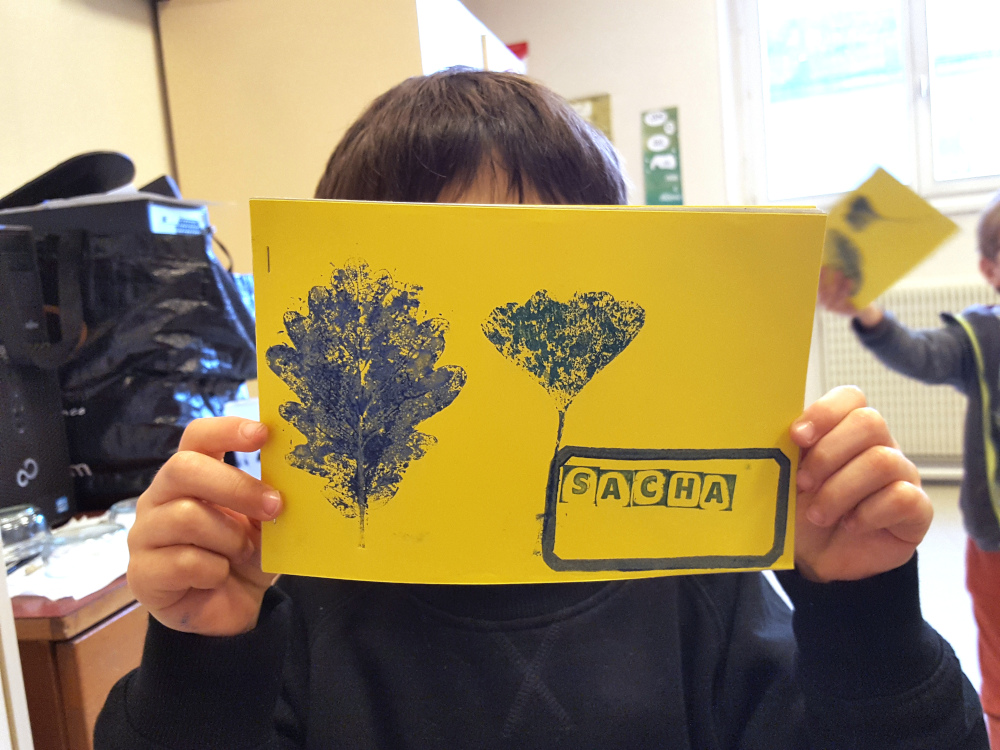élémentaire de la Ville de Grenoble Réalisation d'un petit livret en utilisant différentes techniques d'impression : monotypes, empreintes végétales, tampons, pochoirs.